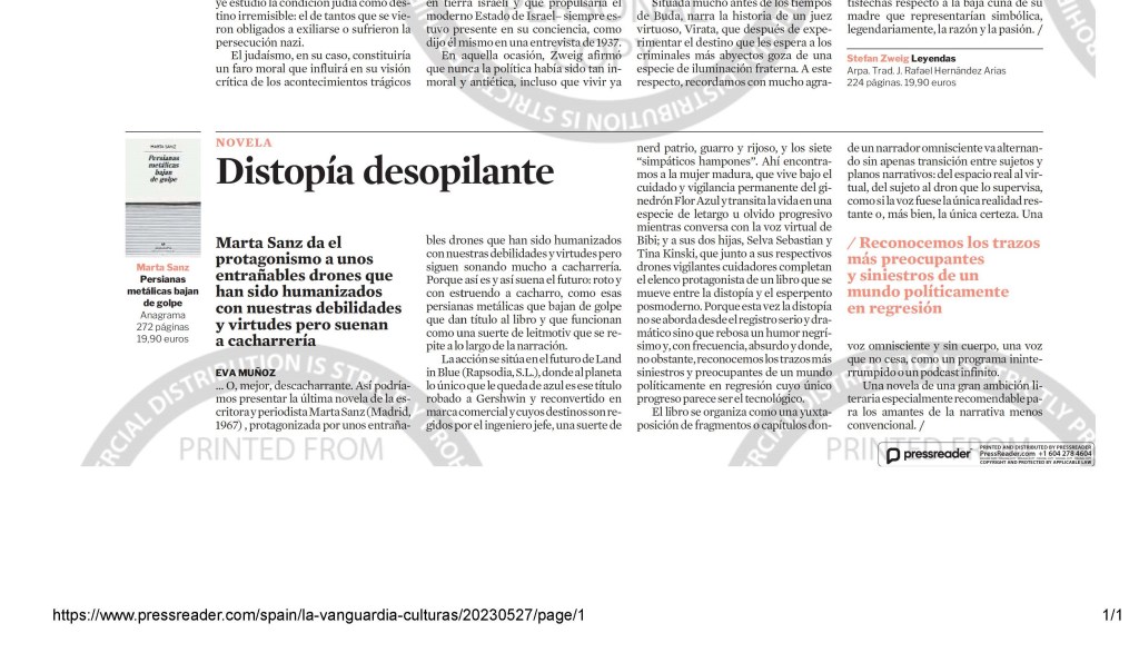 Persianas metálicas bajan de golpe 27 sábado May 2023 Posted by Eva Muñoz in Cultura, Libros ≈ Deja un comentario EtiquetasPersianas metálicas bajan de golpe; Marta Sanz; Anagrama; distopía; dron; tecnología; AI; inteligencia artificial Reseña de la última novela de Marta Sanz publicada en el Cultura/s de La Vanguardia. Comparte esto: Haz clic para compartir en X (Se abre en una ventana nueva) X Haz clic para compartir en Facebook (Se abre en una ventana nueva) Facebook Me gusta Cargando... Relacionado